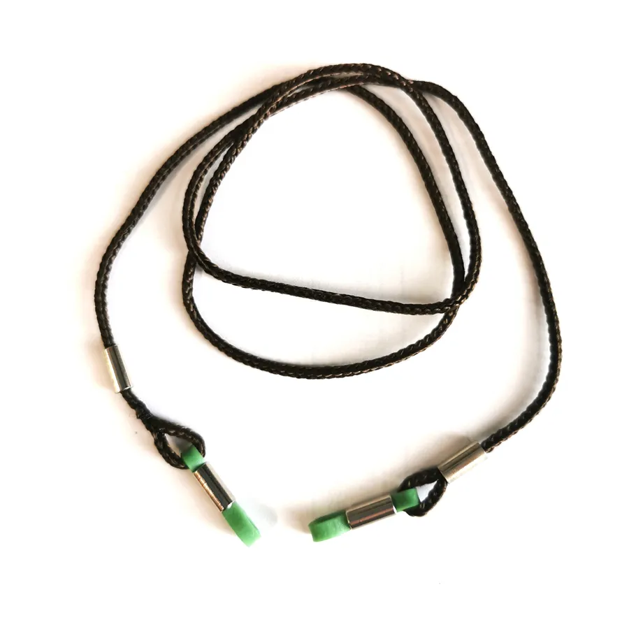 Závěsné upevnění brýlí.Jednotlivá oka závěsné šňůrky navlékneme na obě brýlové stranice těsně za jejich ohyb.Upevnění očka na stranici zajišťujeme přetažením posuvného válečku.